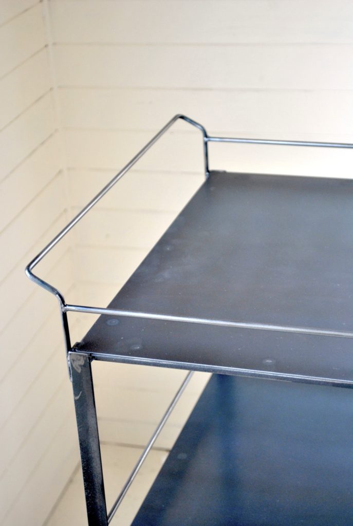 細いアングルと1.6mm厚の鉄板で組んだアイアンワゴンです。鉄板の素地を生かしたクロカワの表面がポイントです。